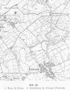 Eine andere Frage ist die nach dem Bau von 1291. Die Existenzdauer kann nur eine sehr beschränkte gewesen sein, da um diese Zeit jene Rittersitze erst entstehen. Aber wo lag die Burg? Die Ansicht ist ohne Grabung nicht zu widerlegen, dass sie eventuell durch den Neubau von 1308 überdeckt ist. Es gibt allerdings auch noch eine andere Erklärung: 2km nordwestlich von unserer Anlage liegt ein einfacher Burghügel, genannt der Schloßberg im Linauer Oberteich. Er befindet sich auf Linauer Boden, wie der Name sagt, und kann nur mit dem starken Rittergeschlecht der Scharpenbergs, die während der ganzen Zeit auf Linau ansässig waren, in Verbindung gebracht werden. So erscheint als beste Lösung, jenen Schloßberg als die Burg von 1291 anzusprechen. Die Entfernung steht dieser Deutung nicht im Wege.